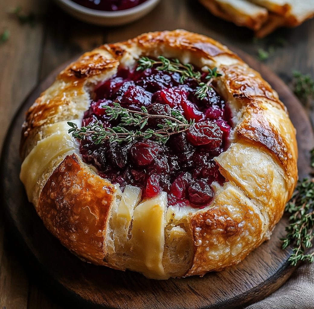 Baked Brie in a Bread Bowl with Cranberry Sauce and Thyme is a deliciously warm treat that combines the creaminess of brie with the tartness of cranberries, all enveloped in a crunchy, rustic bread crust.