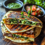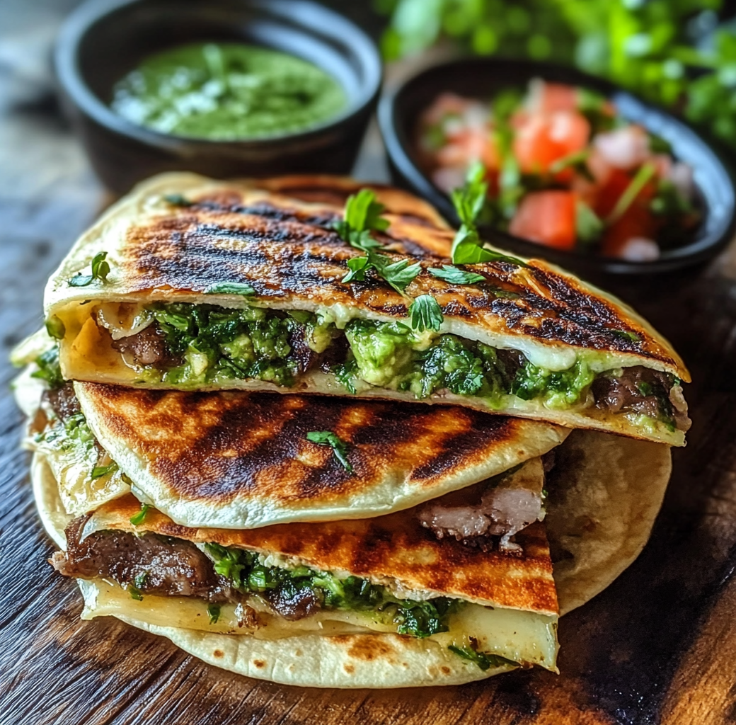 This delicious quesadilla combines grilled steak with chimichurri sauce for a vibrant meal.